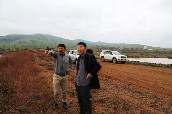 覃儉參贊(右一)及王俊華副總經(jīng)理查看工地