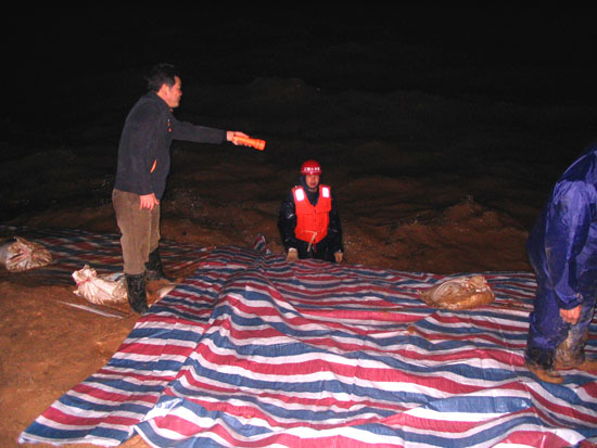 曾俊平等在江水中鋪設防浪彩條布和砼預制塊