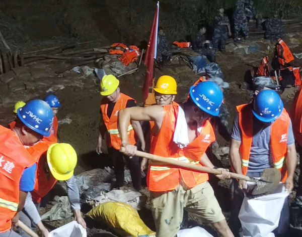 7月13日下午,公司完成封堵工作技術(shù)測(cè)量和封堵工作技術(shù)方案的制定工作。7月13日晚上,搶險(xiǎn)技術(shù)、施工人員及施工機(jī)械設(shè)備陸續(xù)進(jìn)場(chǎng),并調(diào)配塊石、砂礫石等各類材料進(jìn)場(chǎng)。決口封堵采取南北兩岸同時(shí)進(jìn)占方式施工, 7月14日中午14時(shí)開始進(jìn)占施工,經(jīng)過(guò)兩天兩夜連續(xù)55個(gè)小時(shí)施工作業(yè),于7月16日晚上21時(shí)43分,完成決口合攏,比預(yù)計(jì)完工時(shí)間提前50小時(shí)。
