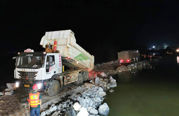 7月13日下午,公司完成封堵工作技術測量和封堵工作技術方案制定,7月13日晚上,搶險技術、施工人員及設備陸續(xù)進場,并調配塊石、砂礫石等各類材料進場。決口封堵采取南北兩岸同時進占方式施工, 7月14日中午14時開始進占施工,經過兩天兩夜連續(xù)55個小時施工作業(yè),于7月16日晚上21時43分,完成決口合攏,比預計完工時間提前50小時。