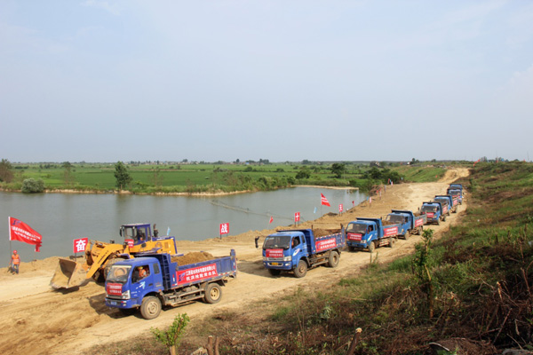 受前期連續(xù)強降雨及長江洪水倒灌、頂托影響,九江市河湖水位長時間處于超警戒水位狀態(tài),導(dǎo)致該地區(qū)防汛形勢十分嚴峻,圩堤險情隨時可能發(fā)生,特別是堤腳處有池塘的圩堤更易出現(xiàn)險情。為確保廬山市沙湖山圩堤長期穩(wěn)固,我司在接到該市防汛指揮部的除險加固任務(wù)后,立即派遣抗洪搶險突擊隊前往現(xiàn)場進行搶險,以穩(wěn)固圩堤,確保圩堤內(nèi)村莊百姓及農(nóng)田安全。經(jīng)過現(xiàn)場勘查,突擊隊決定沿著圩堤腳有池塘的地段填出一條長約1公里、寬20米的壓浸平臺進行加固處理。搶險方案確定后,公司迅速組織了3臺挖掘機、2臺裝載機、36臺自卸汽車等機械設(shè)備及40多名作業(yè)人員頂著炎炎烈日進行施工,力求在10天內(nèi)完成搶險任務(wù),確保圩堤安全。